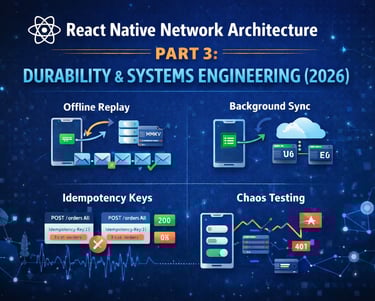Learn how to build durable React Native enterprise network architecture part 3 with offline replay, background sync workers, idempotency, performance tracking, and chaos engineering patterns.