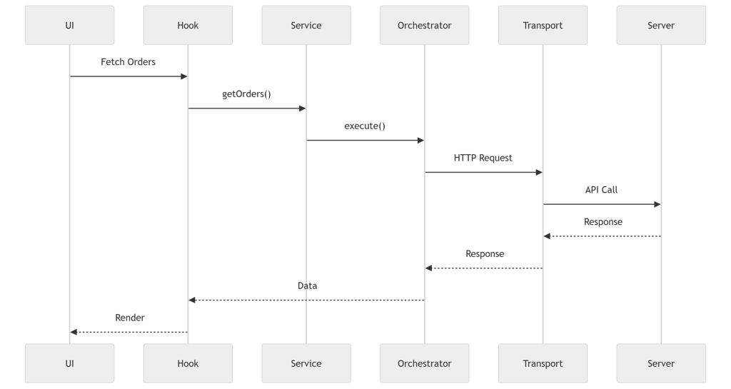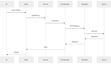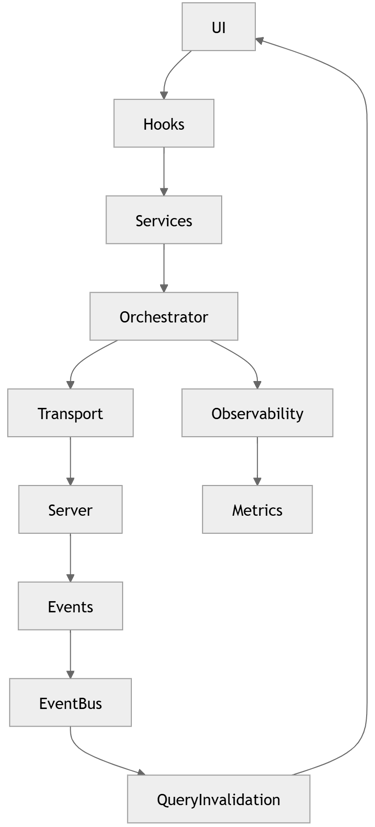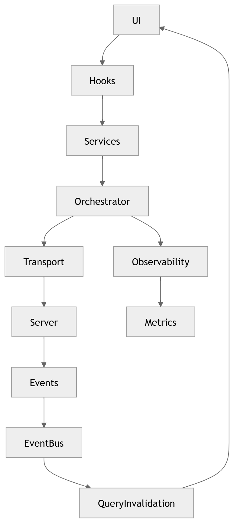 Establishes the layered architecture foundation separating UI, domain hooks, services, and networking systems.